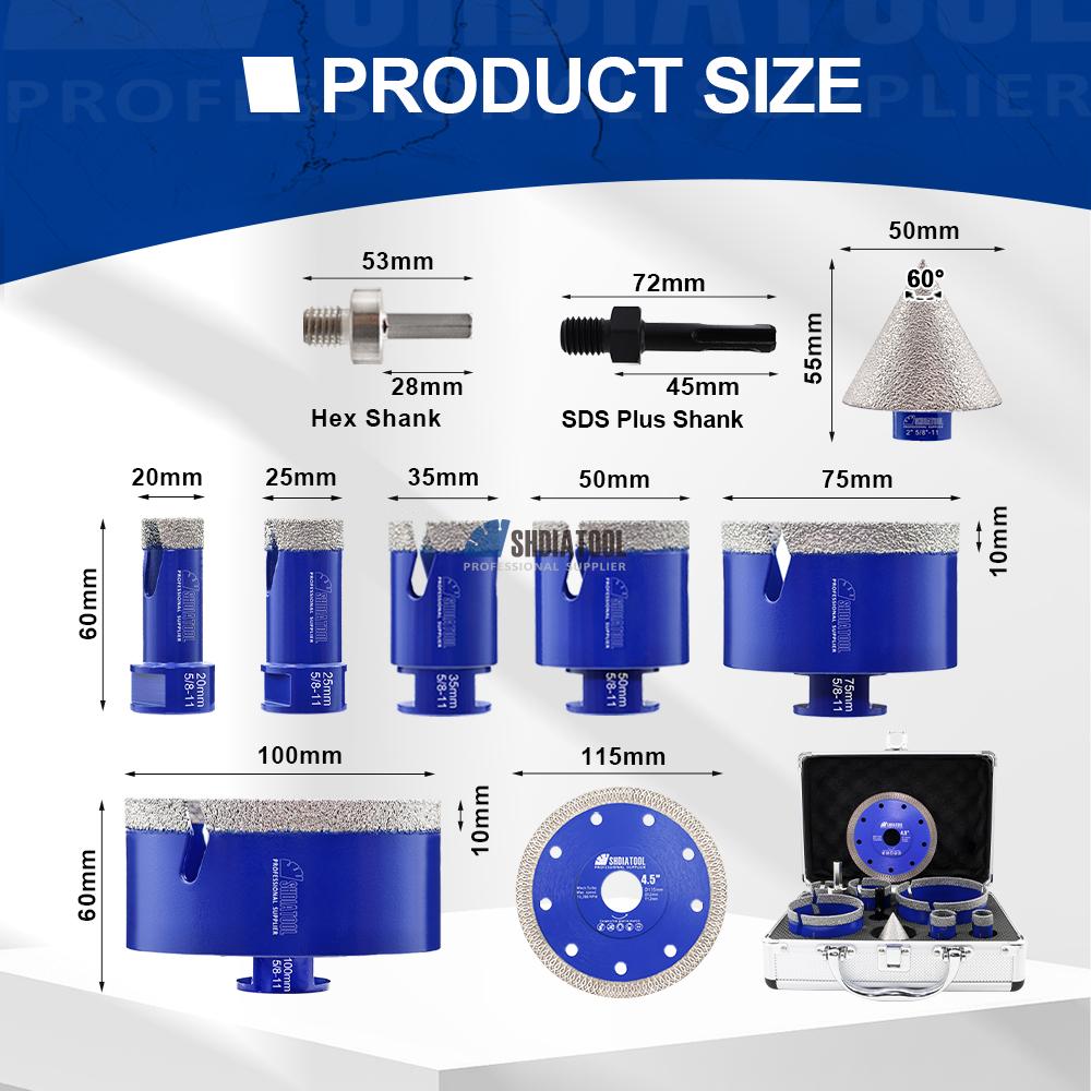 Drill Bit: Dia:20/25/35/50/75/100mm Diamond Height:10mm Total Height:60mm Chamfer Bit: Dia:2'' Working length 46mm Total length: 55mm, Grit #80/100 Saw Blade: Dia:4.5inch/115mm Bore:22.23mm Diamond Height:10mm Adapter: Hex Shank/SDS Shank to 5/8''-11 Package Size: 24*17*10CM |