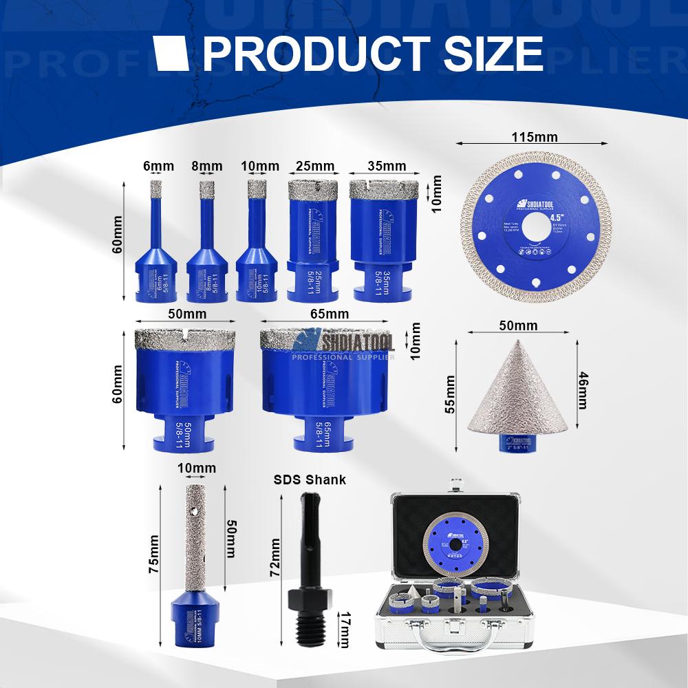 Drill Bit: Diameter 6/8/10/25/35/50/65mm Finger Milling Bit: Diameter 10mm Connection: 5/8''-11; Diamond height 50MM; Total length: 75mm Chamfer Beveling Bit: Diameter 2in/50mm Connection: 5/8''-11; Diamond height 46MM; Total length: 55mm Saw Blade:Diameter 4.5in/115mm Bore:22.23mm Diamond Height:10mm Thickness:1.2mm