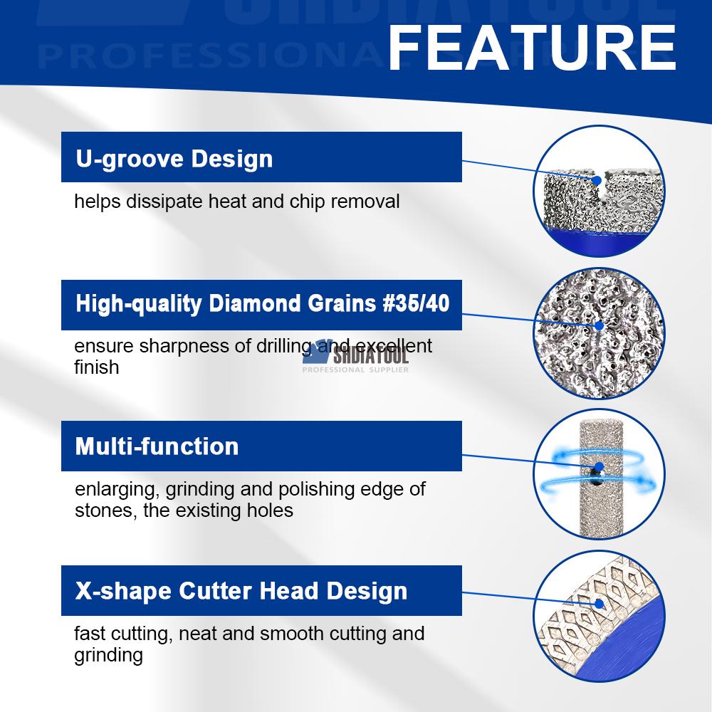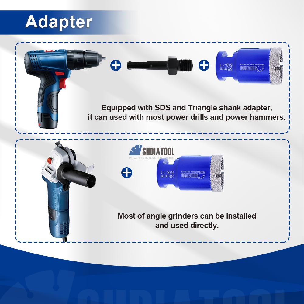 Diamond drill bit set for Wet/Dry Drilling/Milling/Shaping/Enlaging/Cutting on various materials,like Porcelain Ceramic Tile Granite Marble Stone; High-quality diamond raw materials, high hardness and compactness, improve the efficiency and wear resistance of hole drilling.Compatible with most angle grinder/driller,use the adapter to switch freely between the two machines.
