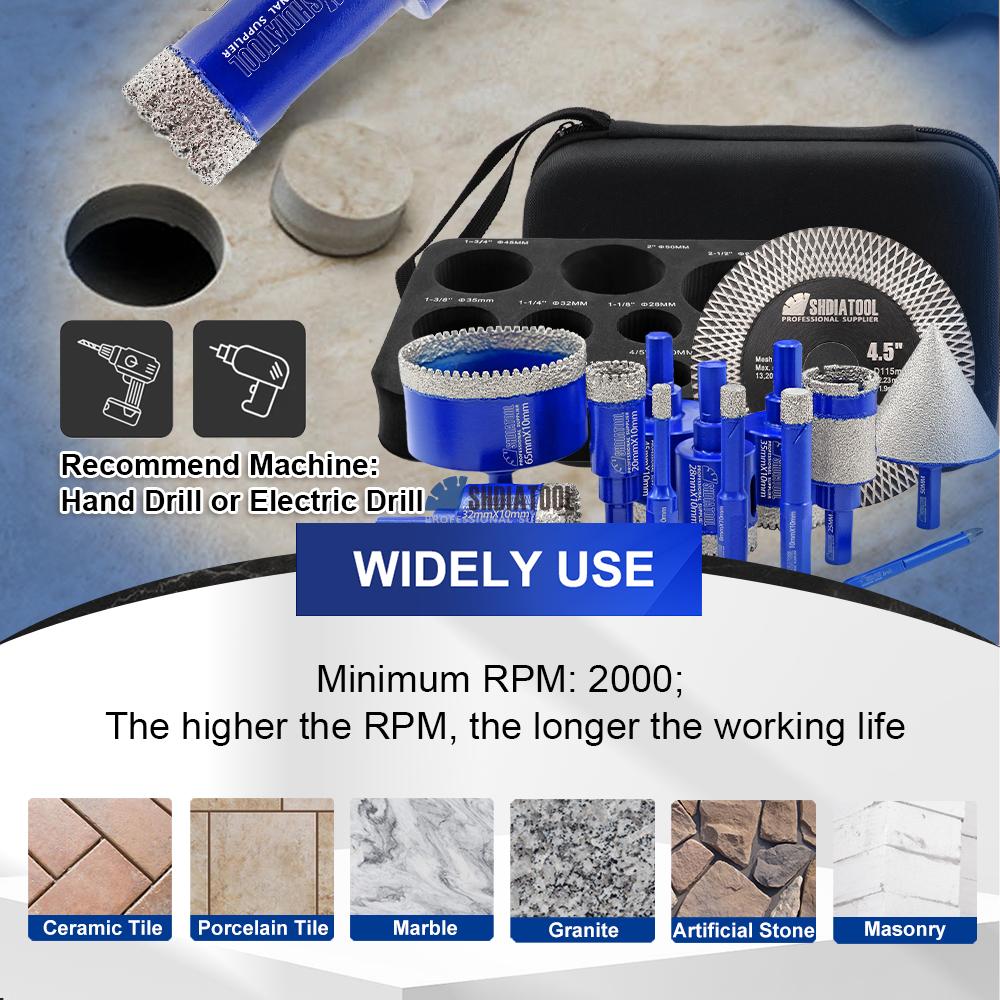 The top of our diamond drill bits set adopts a serrated cutting edge design to make it cut sharper. The multiple gaps between the cutting teeth not only make the cutting resistance smaller, but also greatly enhance the chip removal ability of the hole saw. Make cutting and drilling faster and more accurate.Dry drilling/milling/beveling for porcelain tile, granite, marble, stone, Masonry, brick.