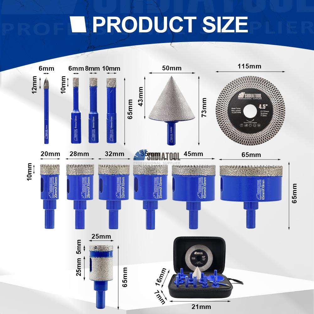Drill Bit: Shank:Triangle Shank Diameter:6/8/10/20/28/32/35/45/65MM Diamond Height:10MM Total Length: 65MM Chamfer Bit: Shank:Hex Shank Diamter:50mm Working length:43mm Grit:#80 Milling Cutter: Shank:Triangle Shank Diameter:25mm Drilling Height:5mm Milling Height:25mm Double Sided Saw Blade: Diameter:115mm Front Diamond Height:20mm Back Diamond Height:10mm Bore:7/8in Thickness:1.9mm Box Size:21*16*7CM |