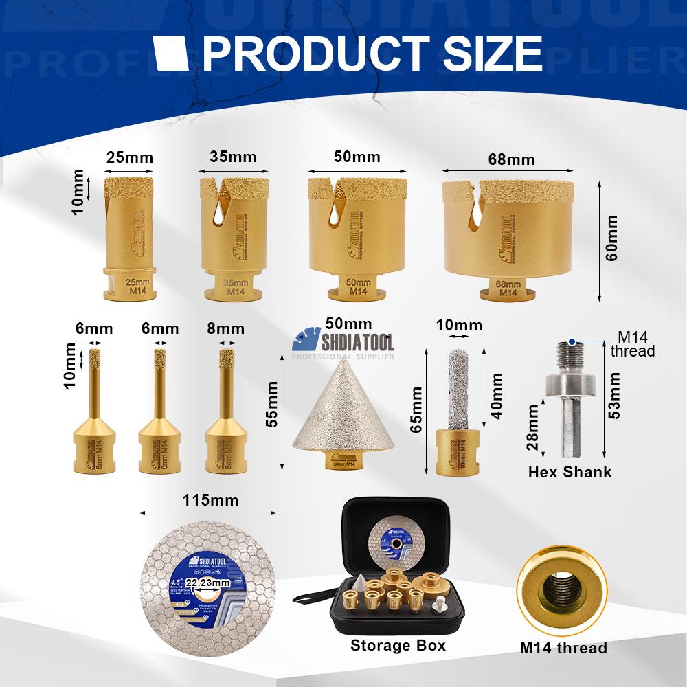 7PCS (6/6/8/25/35/50/68MM) Drill Bits: Diamond Height:10mm Thread:M14 1PC(10mm) Milling Bit: Diamond Height:40mm Thread:M14 1PC(2''/50mm)Chamfer Bit: Diamond Height:40mm Thread:M14 1PC(4.5inch/115mm)Saw Blade: Bore:23.23mm Diamond Height:20mm 1PC Hex Shank Adapter:M14 to Hex Shank Package Size:21*16*7CM |