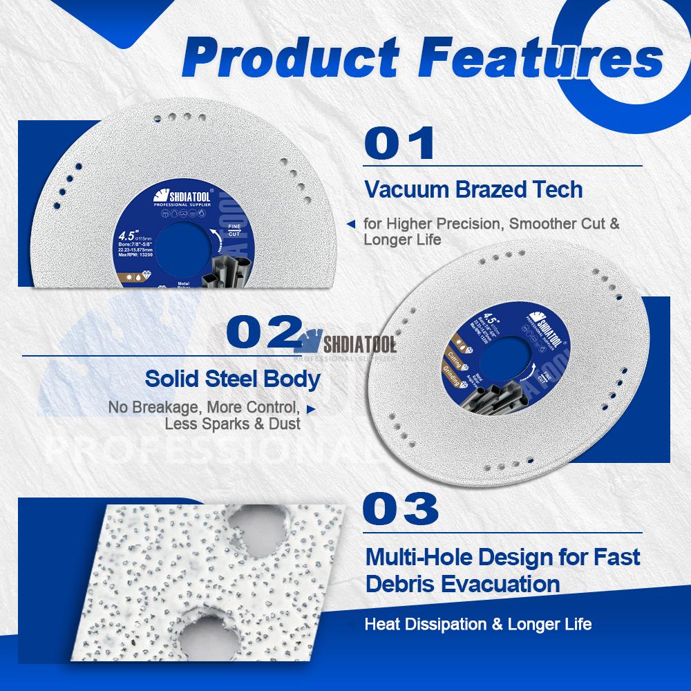 1. The blade features a high-quality diamond coating on a steel substrate, combined with vacuum brazing technology, ensuring uniform distribution of diamond abrasive grains along the cutting edge. This enhances cutting precision and performance while extending service life; 2. The solid steel body reduces the risk of breakage. Compared to resin-bonded cutting blades, it is safer and more reliable, offering greater control, producing fewer sparks and less dust, and maintaining a cleaner work environment; 3.Professional-grade quality enables extended cutting sessions, enhanced durability, and excellent value for money; 4. The perforated blade head allows for rapid heat dissipation, ensuring sharp cutting and uniform grinding force; |