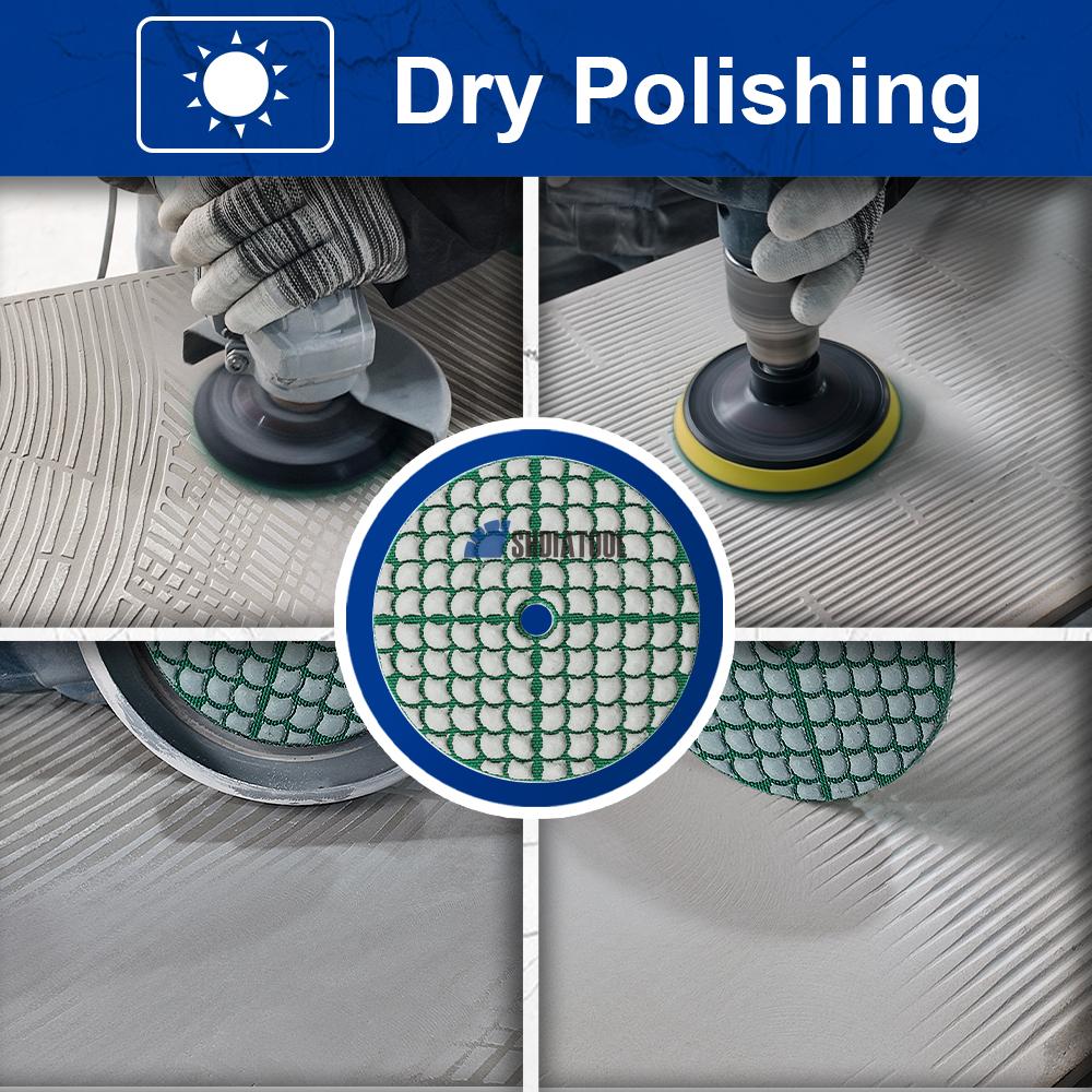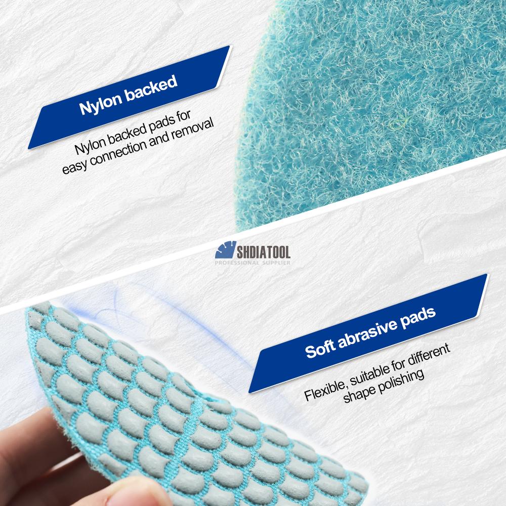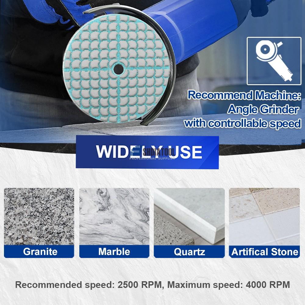 These polishing pads are made of high quality diamond and resin. Fast grinding force, good flexibility,wear-resistance, high polishing efficiency and long service life;Designed for dry&wet polishing, less dust, improve gloss finish in a short time.Designed with nylon back fleece, which has strong adhesiveness and firm paste, and can be repeatedly peeled and pasted without damage.