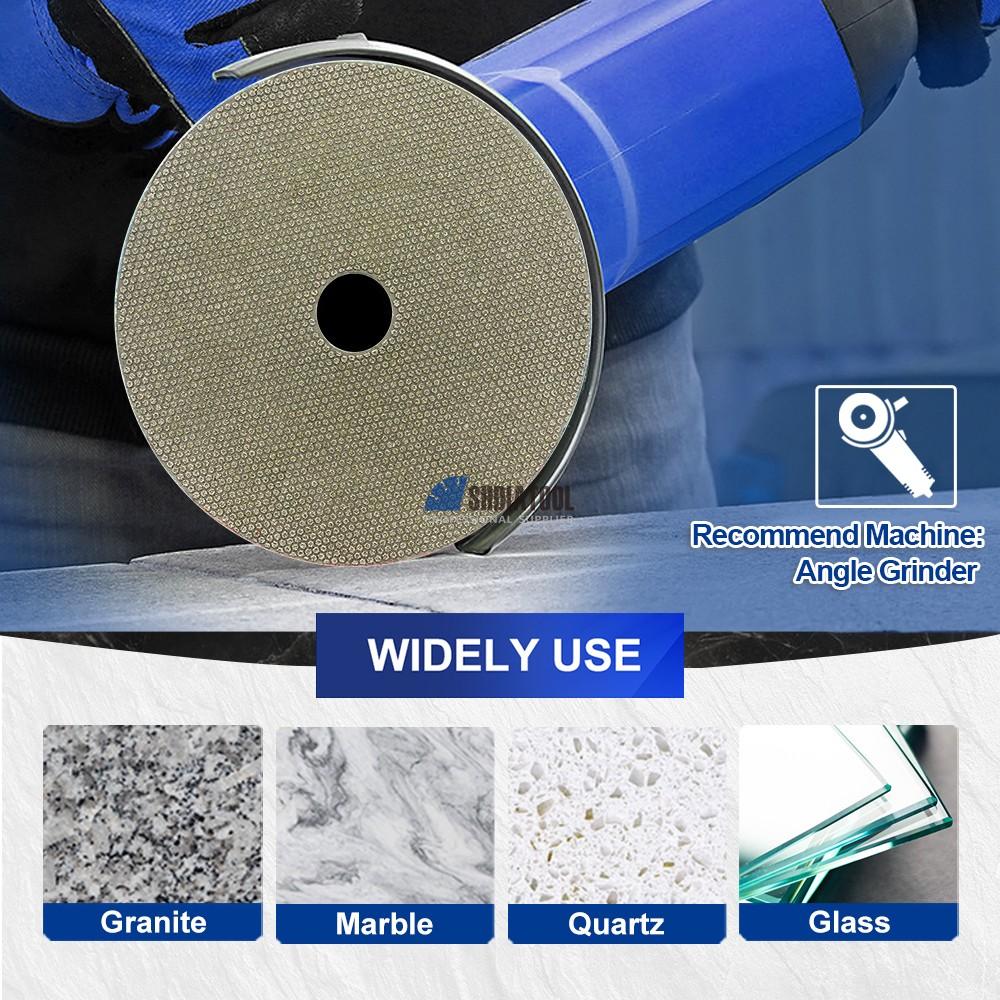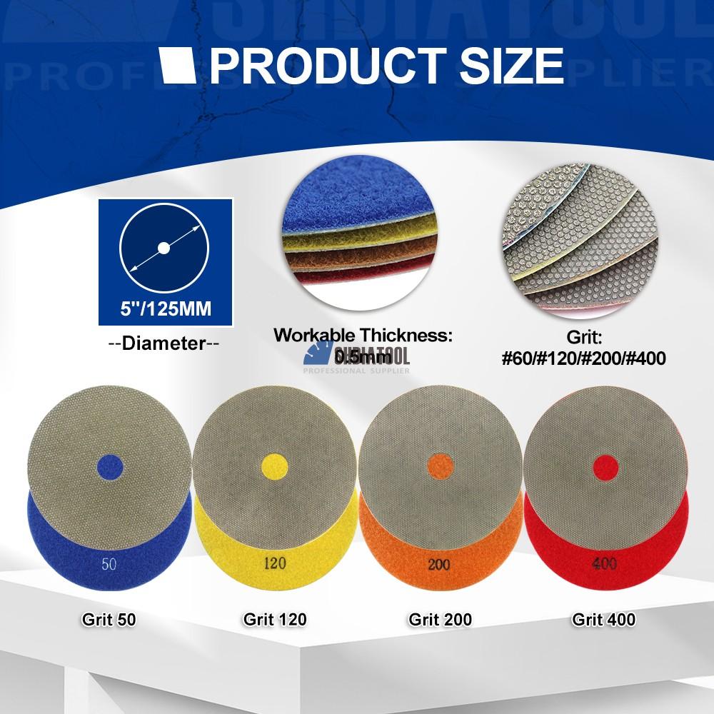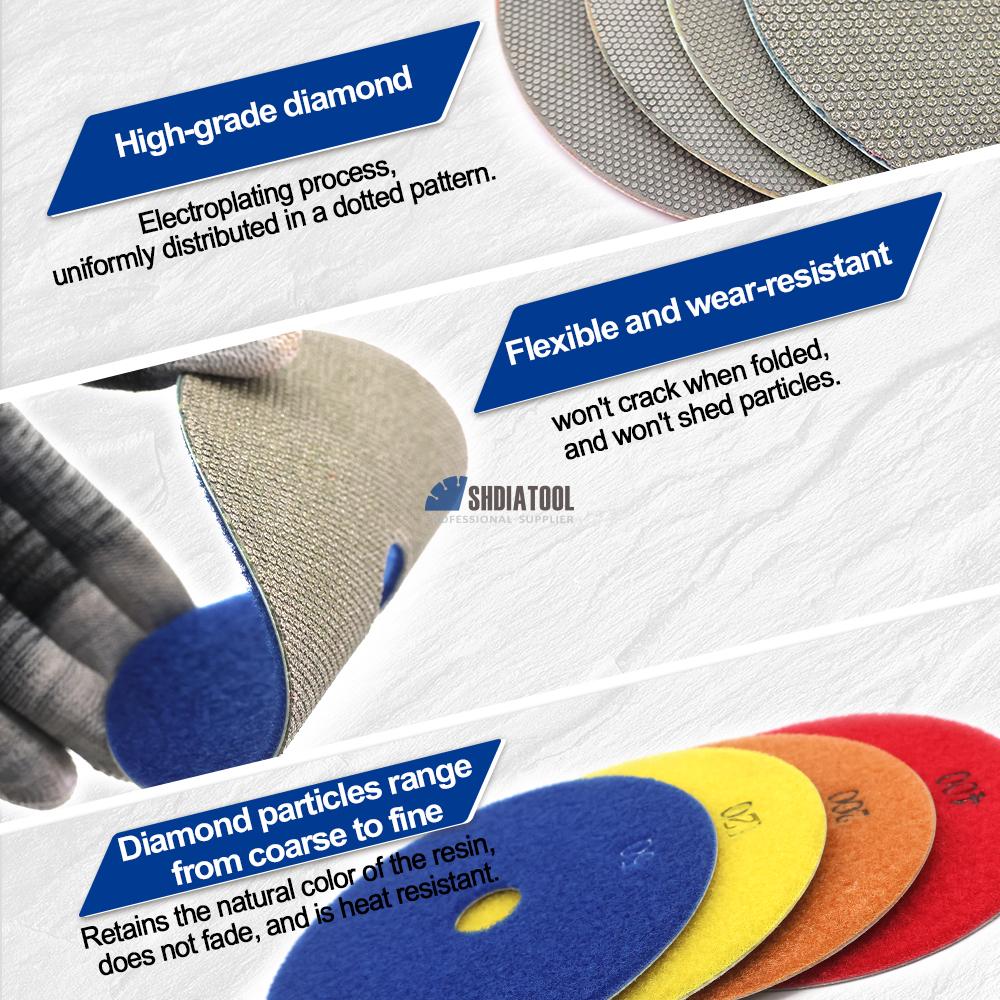 Electroplated diamond soft polishing pads feature a flexible backing that conforms to contours while delivering aggressive cutting on hard surfaces. Ideal for removing scratches on granite, marble, tile,glass. The electroplated diamond layer ensures fast material removal, while the soft base minimizes the risk of gouging. Fits standard 4" angle grinders with hook-and-loop backing