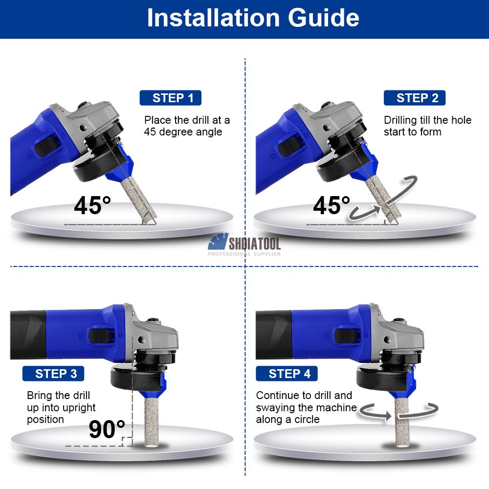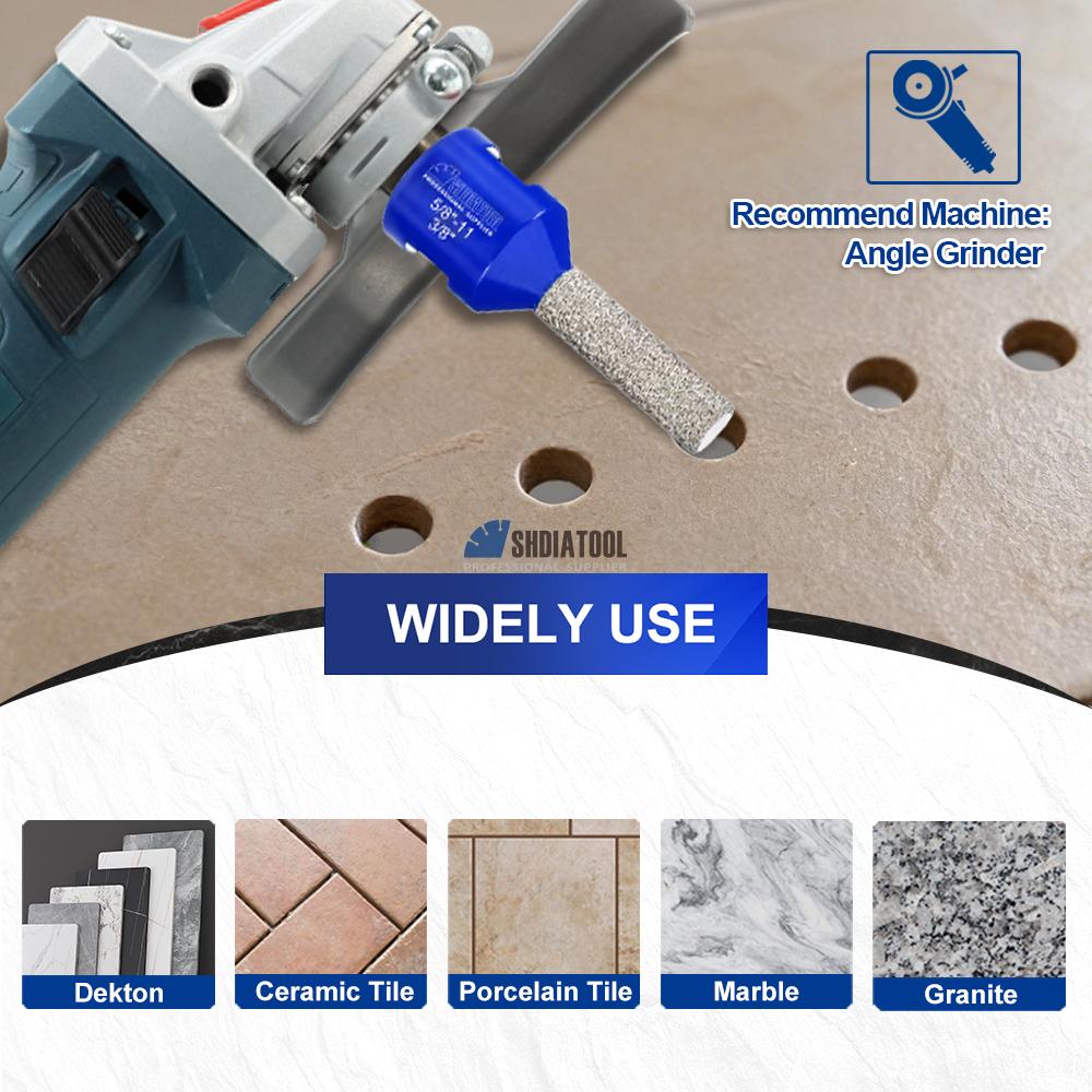 1. Innovative integrated grinding-drilling design eliminates sequential drilling and grinding steps, enabling simultaneous drilling and grinding for exceptional efficiency; 2. Top diamond grit #45/50 ensures rapid, smooth penetration with clean,chip-free holes, minimal material loss, and superior surface finish; 3. Cooling wax insert provides cooling and lubrication; 4.Premium steel construction with advanced vacuum brazing technology ensures sharpness, durability, and extended service life; 5.Capable of hole enlargement, grinding, and drilling, suitable for diverse drilling applications; 6. Dry/wet dual-use design with M14 or 5/8"-11 threading for angle grinders, enabling convenient operation. |