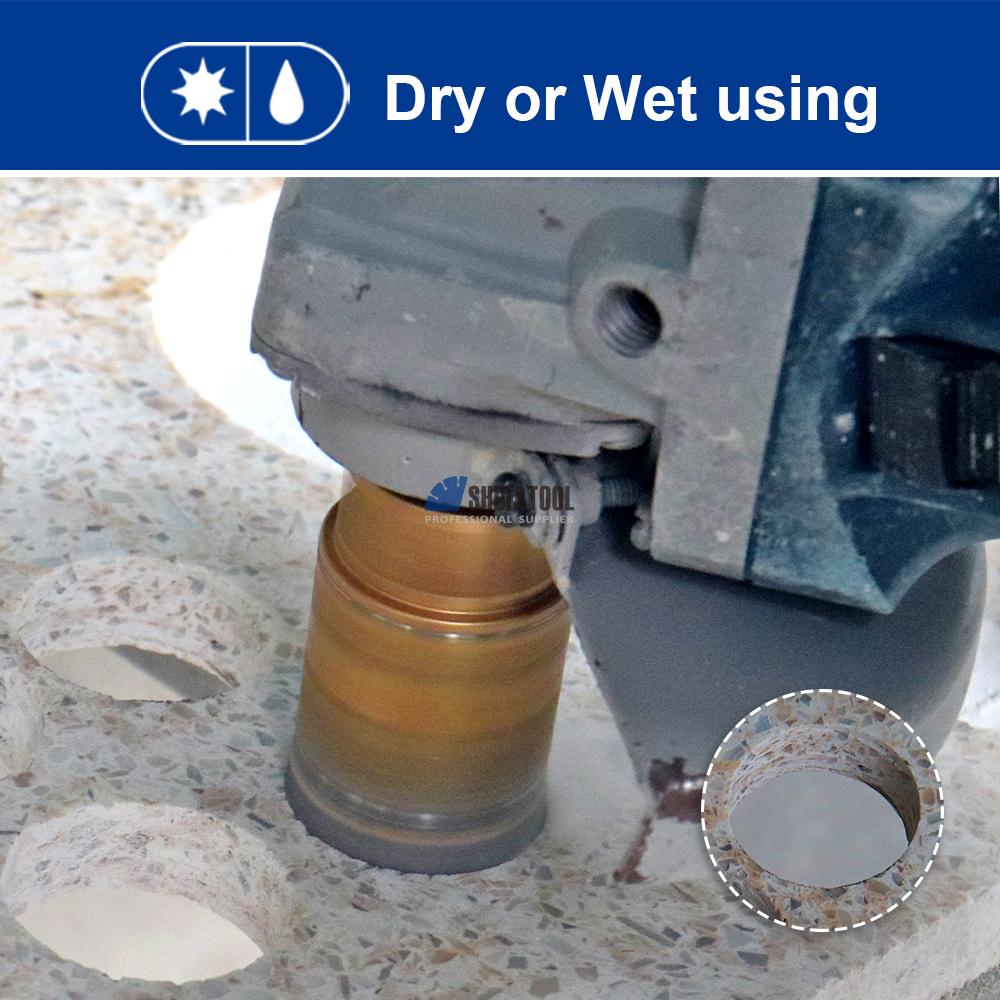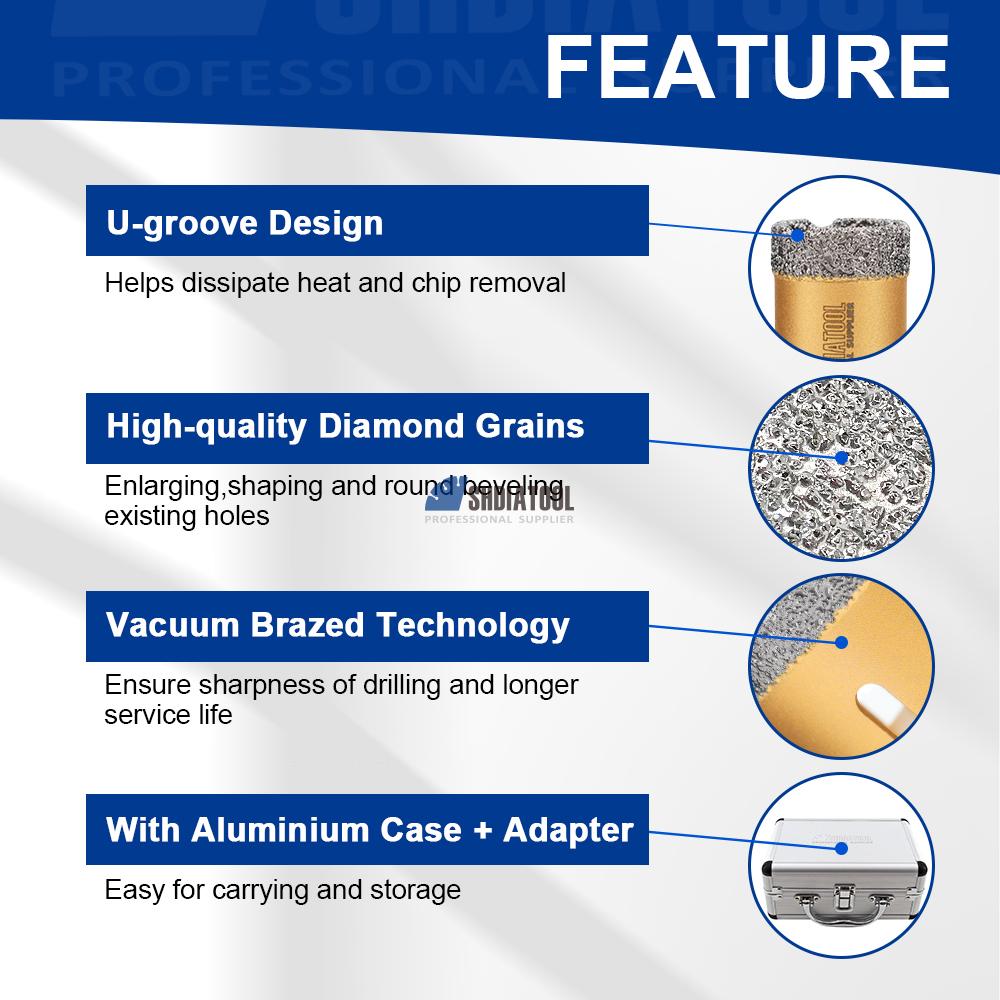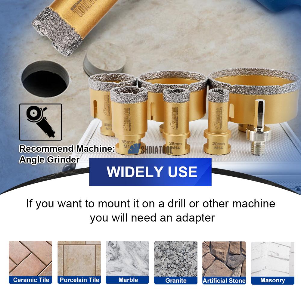 Worked great for dry drilling holes through porcelain ceramic tile shower walls, ceramics, bathroom tile,marble ,granite,stone,masonry,brick,stucco,counter top with ease.Using vacuum brazed technology ,which increases resistance to temperature and friction,to make the diamond particles better attach to the core steel,imporve the performance and lifetime.