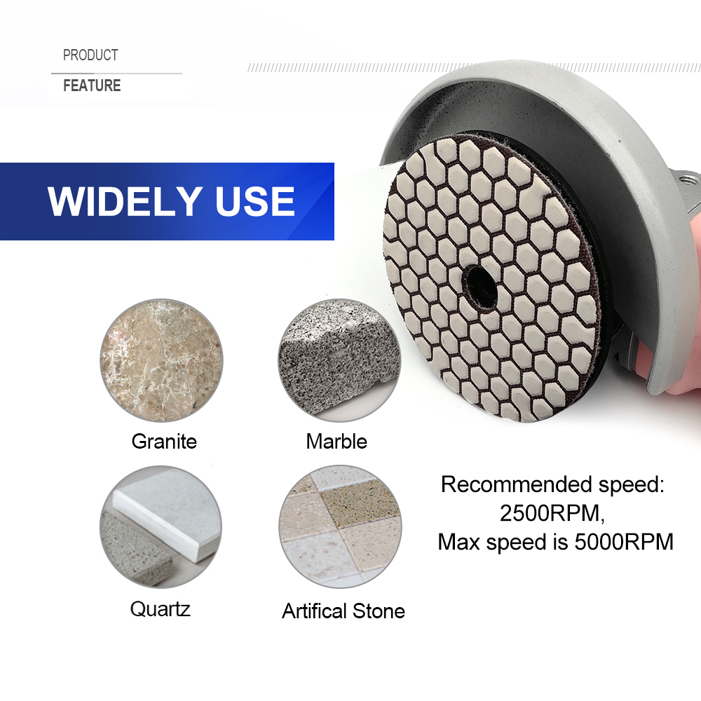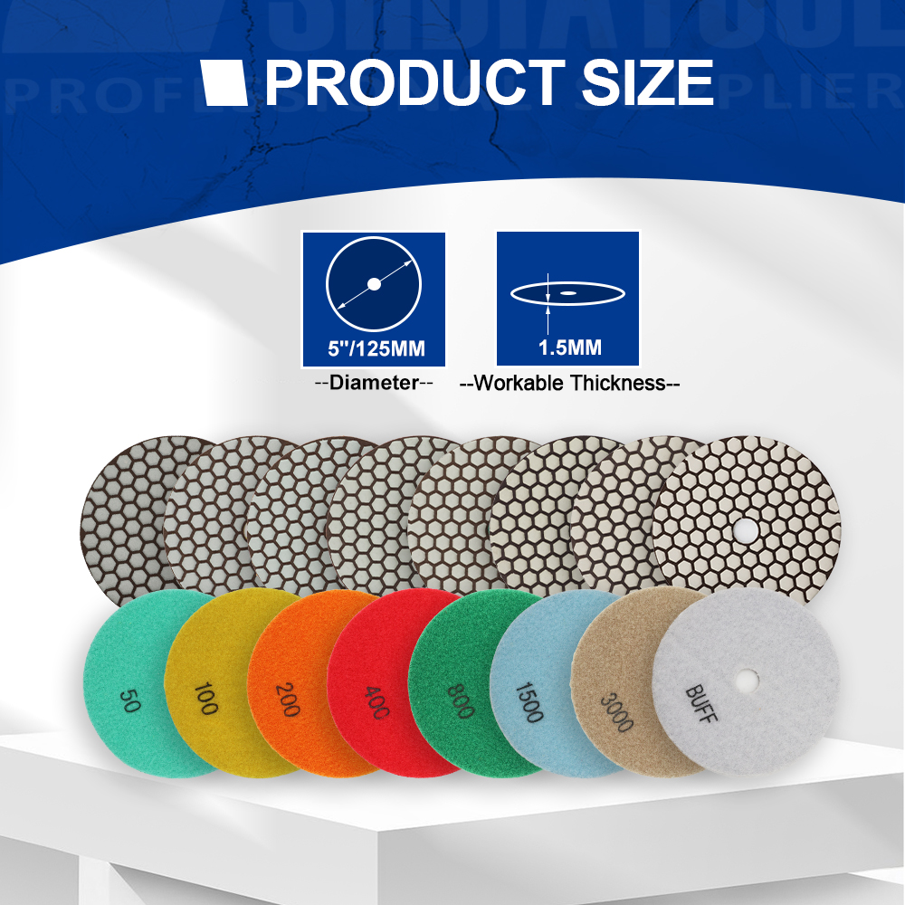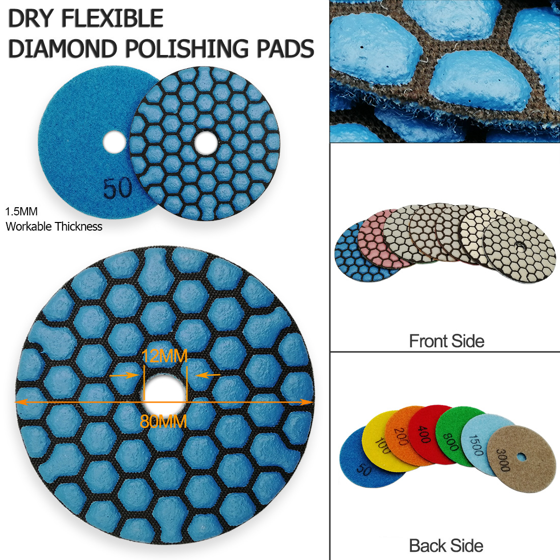 3in/4in/4.5in x1.5mm dry diamond polishing pads Special bond optimized to polish granite, marble and other stone Suitable for dry use Flexible pad for easy work on curved surface and corners Grit 30,50,100,200,400,800,1500,3000 white buff.