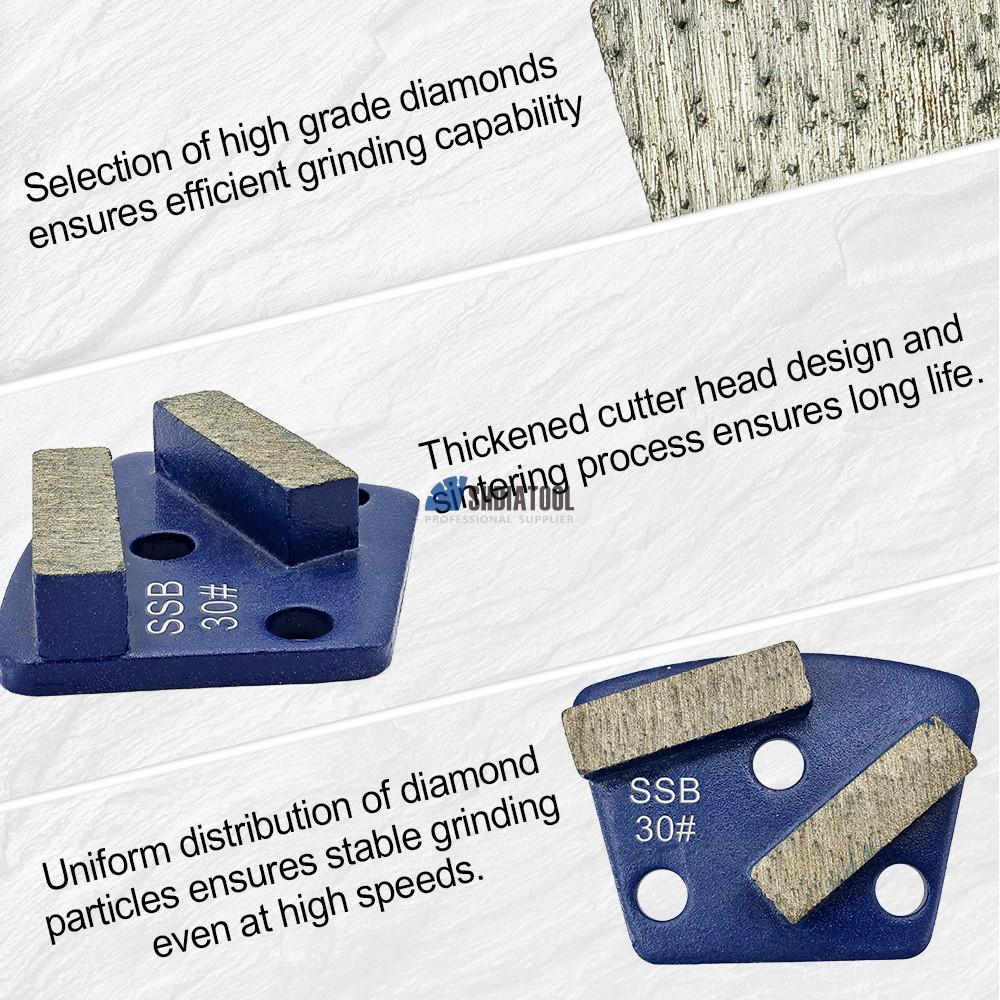 Unique trapezoid shape with 2 long teeth provides optimal contact area and extended service life. Engineered for fast stock removal with low vibration and noise. Saves time on concrete floor refinishing, coating removal, and surface preparation projects.Suit for HTG Floor Grinder