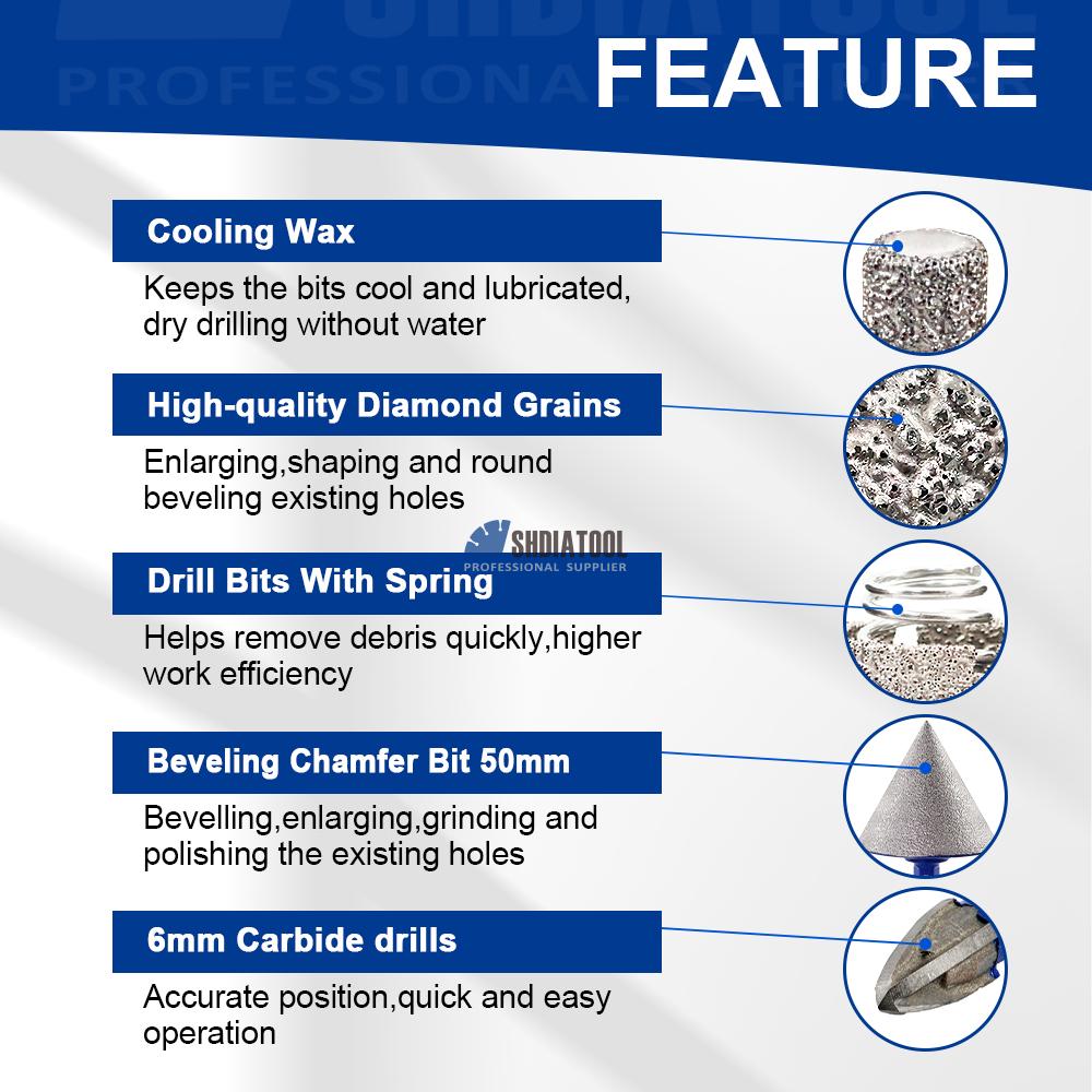 Triangle Shank Diamond Core Drill Bit Chamfer Set – Precision Drilling & Edge Beveling Kit.Combine clean hole drilling and safety edge chamfering in one complete, ready-to-use kit. Featuring a standard triangle (triangular) shank – the preferred interface for Bosch, Hilti, Makita, and this set delivers chip-free, breakout-free results on granite, quartz, porcelain tile, marble, ceramic.