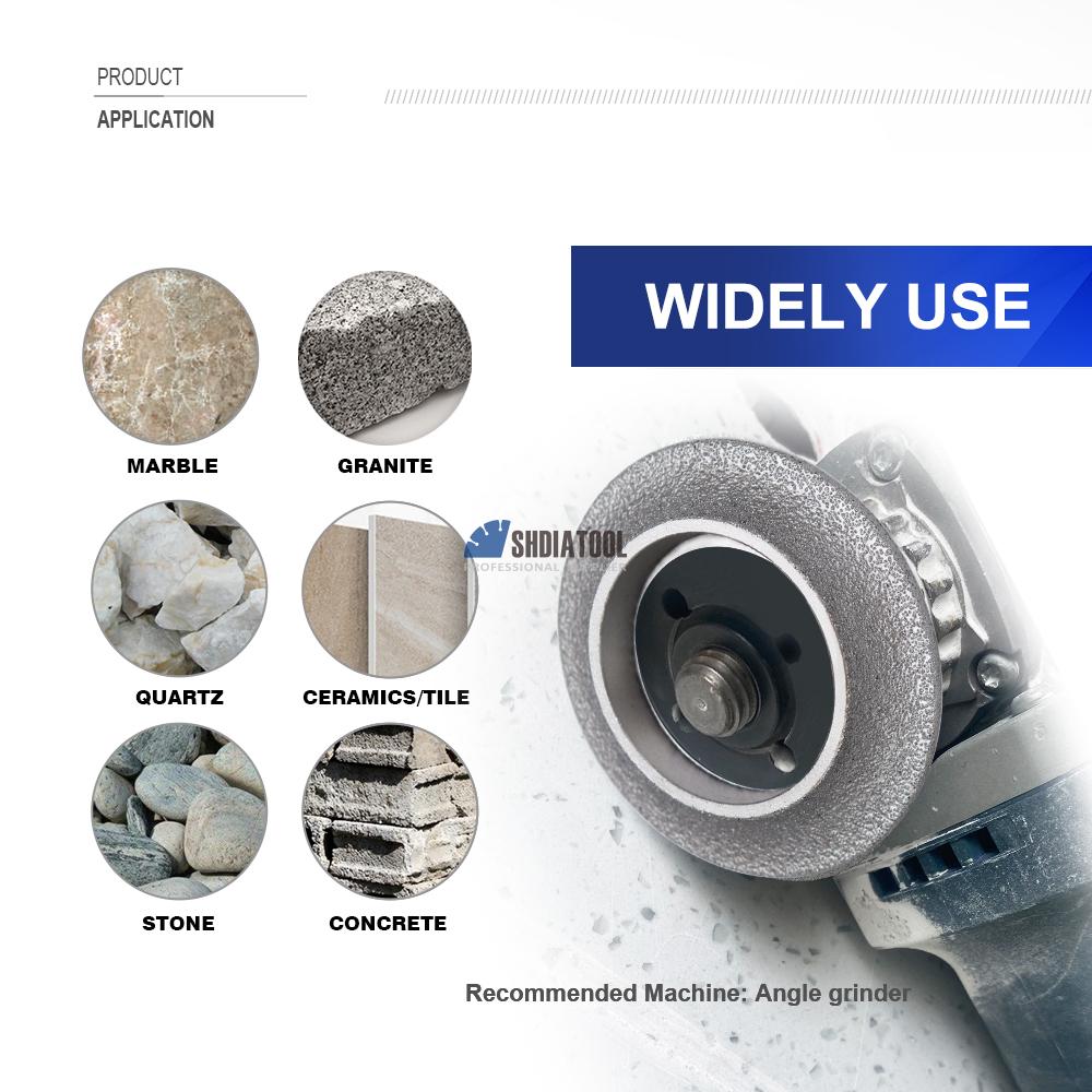 1. Vacuum brazed technology provide high efficient working performance and longer working life,several times better than electroplated. 2. High quality steel body, one-time forming, not easy to deform. 3.A variety of shapes, can be used for stone trimming, chamfering, modeling. 4.Can be used dry or wet. |
